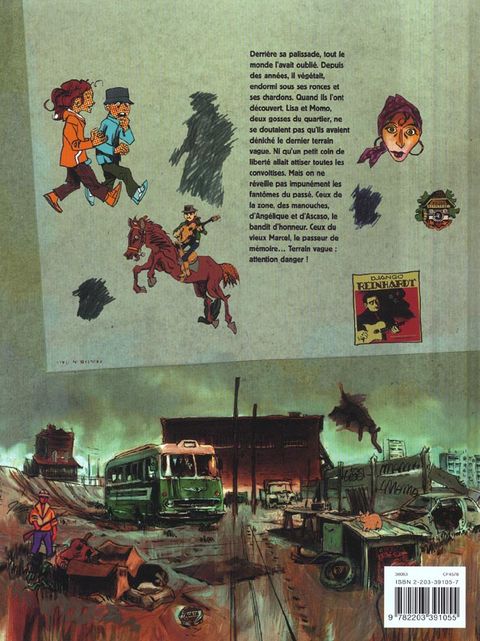 Derrière sa palissade, tout le monde l'avait oublié. Depuis des années, il végétait, endormi sous ses ronces et ses chardons. Quand ils l'ont découvert, Lisa et Momo, deux gosses du quartier, ne se doutaient pas qu'ils avaient déniché le dernier terrain vague. Ni qu'un petit coin de liberté allait attiser toutes les convoitises. Mais on ne réveille pas impunément les fantômes du passé. Ceux de la zone, des manouches, d'Angélique et d'Ascaso, le bandit d'honneur. Ceux du vieux Marcel, le passeur de mémoire... Terrain vague : attention danger !