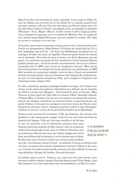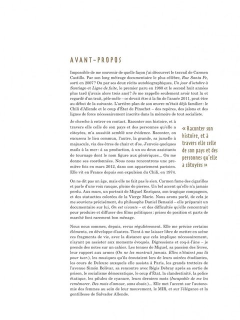 Chili 1973. Carmen Castillo et son mari font partie du cercle des proches du Président Allende. Suite au coup d'état du Général Pinochet, ils décident d'entrer en résistance. Installée aujourd'hui en France, elle a fait le récit à Maximilien Le Roy de son histoire, une histoire de clandestinité, d'angoisse, de torture, de loyauté sans faille,... Une histoire de vaincus. Un histoire de héros.