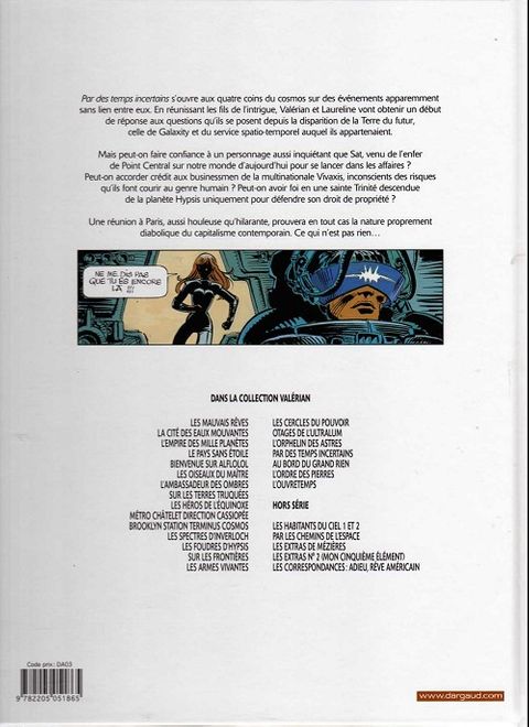 Par des temps incertains s'ouvre aux quatre coins du cosmos sur des événements apparemment sans lien entre eux. En réunissant les fils de l'intrigue, valérian et laureline vont obtenir un début de réponse aux questions qu'ils se posent depuis la disparition de la terre du futur, celle de galaxity et du service spatio-temporel auquel ils appartenaient. mais peut-on faire confiance à un personnage aussi inquiétant que sat, venu de l'enfer de point central sur notre monde d'aujourd'hui pour se lancer dans les affaires ? peut-on accorder crédit aux businessmen de la multinationale vivaxis, inconscients des risques qu'ils font courir au genre humain ? peut-on avoir foi en une sainte trinité descendue de la planète hypsis uniquement pour défendre son droit de propriété ? une réunion à paris, aussi houleuse qu'hilarante, prouvera en tout cas la nature proprement diabolique du capitalisme contemporain. Ce qui n'est pas rien...