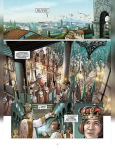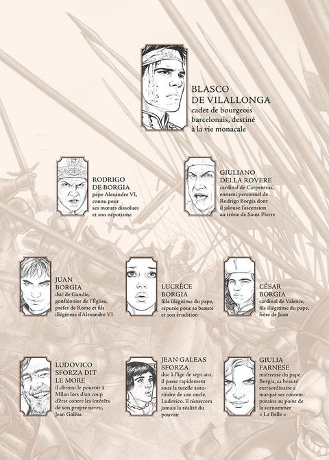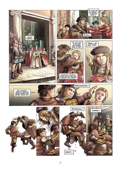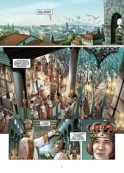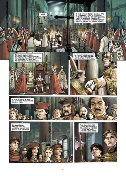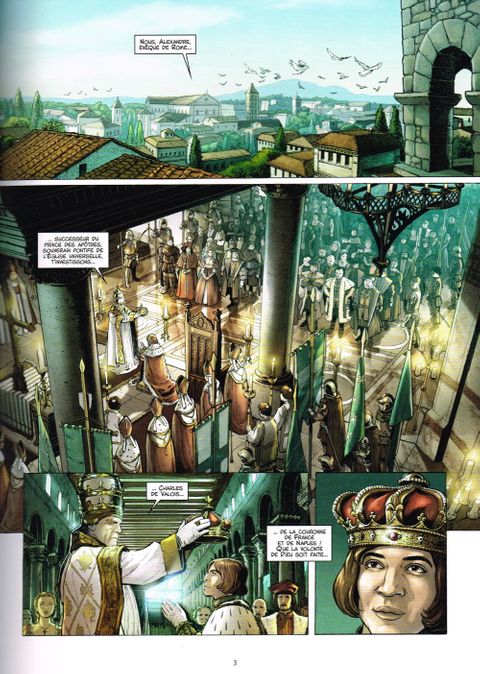 En 1495, le Pape Borgia sauve sa tête en couronnant celle du descendant de Saint-Louis. Par cet acte solennel, il fait du Valois le successeur légitime d'Alfonse II. Légalement, la route de Naples est grande ouverte. Lorsque les participants de la messe sortent de l'église, Lucrèce et son mari s'embrouillent bruyamment. Henri et Blasco chargés de la sécurité du cortège sont alors pris à partie.