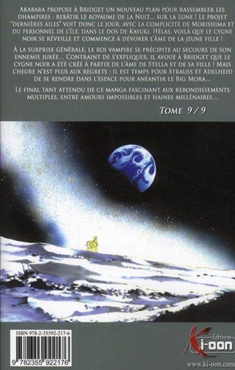 Akabara propose à Bridget un nouveau plan pour rassembler les Dhampires : rebâtir le royaume de la nuit... Sur la lune ! Le projet ""dernières ailes "" voit donc le jour. Avec la complicité de Morishima et du personnel de l'Ile, dans le dos de Kayuki. Hélas, voilà que le cygne noir se réveille et commence à dévorer l'âme de la jeune fille ! A la surprise générale, le roi vampire se précipite au secours de son ennemie jurée... Contraint de s'expliquer. Il avoue à Bridget que le cygne noir a été créé à partir de l'âme de Stella et de sa fille ! Mais l'heure n'est plus aux regrets : Il est temps pour Strauss et Adelheid de se rendre dans l'espace pour anéantir le Big Mora... Le final tant attendu de ce manga fascinant aux rebondissements multiples, entre amours impossibles et haines millénaires...