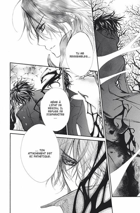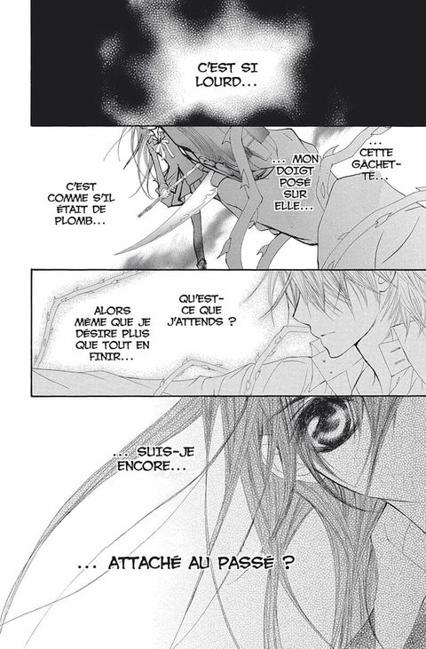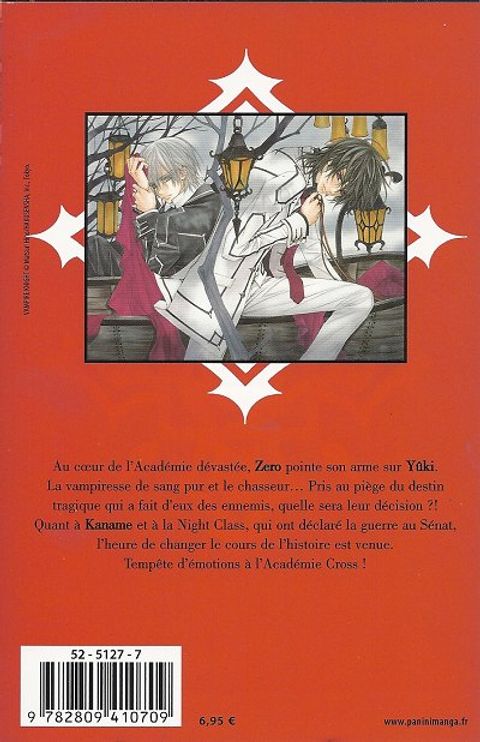 Au coeur de l'Académie dévastée. Zero pointe son arme sur Yûki. La vampiresse de sang pur et le chasseur... Pris au piège du destin tragique qui a fait d'eux des ennemis, quelle sera leur décision ?! Quant à Kaname et à la Night Class, qui ont déclaré la guerre au Sénat, l'heure de changer le cours de l'histoire est venue. Tempête d'émotions à l'Académie Cross !