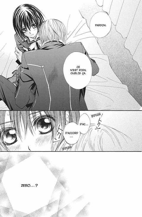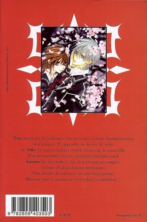 Zero, rongé par la souffrance que provoque sa lente dégénérescence vers le level : e, approche ses lèvres de celles de yuki. Ce baiser manqué trouble beaucoup la jeune fille. plus déconcertant encore, quelques jours plus tard, kaname lui demande si elle veut devenir un vampire. victime d'hallucinations terrifiantes, yûki décide de retrouver ses souvenirs perdus. mais un nouvel ennemi se dresse dans les ténèbres.