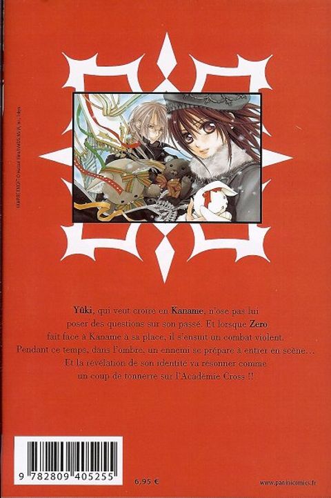 Dans les larmes et dans le sang, le voile se lève enfin sur le lourd passé de Yûki ! Mais alors qu'elle ouvre les yeux sur son monde, Zero sombre. Grâce à sa persévérance, Matsuri Hino est devenue l'un des plus populaires auteurs de shôjo. Ses premiers essais ont connu un succès mitigé jusqu'à sa série Toraware no Minoue qui la révélera au public. Elle enchaînera ensuite sur l'immense succès commercial Meru Puri Märchen Prince (publié aux éditions Panini Manga) traduit dans de nombreux pays. Après le one-shot Wanted, la jeune mangaka débute le magnifique Vampire Knight classé au top des ventes shôjo françaises et japonaises.