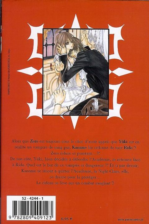 Alors que Zéro est toujours sous le choc d'avoir appris que Yûki est en réalité un vampire de sang pur, Kaname lui ordonne de tuer Rido !! Zéro refuse et pourtant... ?! De son côté, Yûki, bien décidée à défendre l'Académie, se retrouve face à Rido. Quel est le but de ce vampire si dangereux ?! Et si par devoir, Kaname se résout à quitter l'Académie, la Night Class, elle, se dresse pour la protéger... Le rideau se lève sur un combat sanglant !!