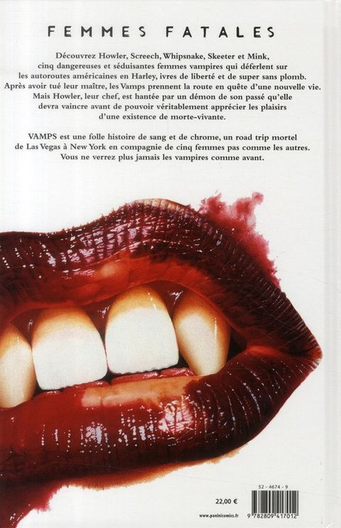 Cette année, Vertigo plonge ses crocs dans le très à la mode monde des vampires. Quoi de plus naturel pour notre gamme de comics réservés aux lecteurs avertis ! Alors qu'American Vampire vous propose ce même mois la dernière-née des séries consacréesau genre, voici l'un des ouvrages de référence sur le sujet. Vamps est paru pour la première fois aux États-Unis en 1995 mais cette saga culte est publiée pour la première fois en France ! Écrite par l'actrice et auteur de théâtre Elaine Lee (également coloriste de comic-books à ses heures perdues), et dessinée par William Simpson (Hellblazer), cette épopée vous propose de découvrir un quintet de vampires motardes cherchant à fuir le vampire qui les a «créées».