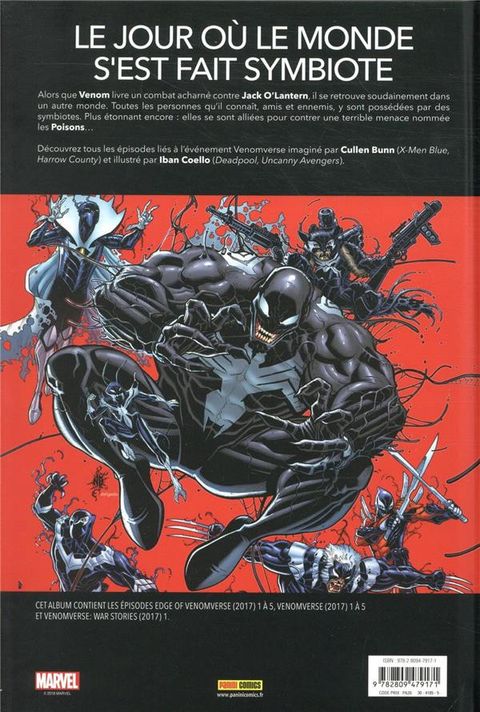 Marvel propose une saga centrée sur Venom dans la lignée de Spider-Verse. Les prologues sont confiés à plusieurs équipes créatives tandis que le récit principal est l'oeuvre de Cullen Bunn (Minimum Carnage) et Iban Coello (Venomized). Les Poisons chassent les symbiotes à travers le multivers. Transporté dans un monde qu'il ne connaît pas, avec une troupe de super-héros vénomisés, Venom va lutter pour sa survie, celle de son espèce et de tout le multivers !