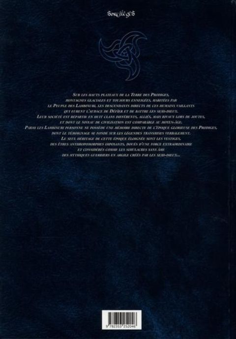 Sur les hauts plateaux de la terre des prodiges, montagnes glaciales et toujours enneigées, habitées par le peuple des Lambinubi, les descendants directs de ces humains vaillants qui eurent l'audace de défier et de battre les semi-dieux. Leur société est répartie en huit clans différents, alliés, mais rivaux lors de joutes, et dont le niveau de civilisation est comparable au Moyen Age. Parmi les Lajibinubi personne ne possède une mémoire directe de l'époque glorieuse des prodiges, dont le témoignage se fonde sur les légendes transmises verbalement. Le seul héritage de cette époque éloignée sont les vestiges, des êtres anthropomorphes imposants, doués d'une force extraordinaire et considérés comme les simulacres sans âme des mythiques guerriers en argile créés par les semi-dieux...