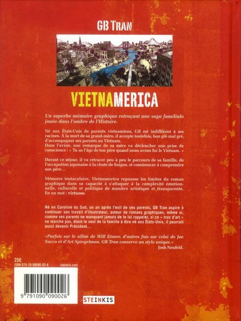 Né aux États-Unis de parents vietnamiens, GB Tran n'est absolument pas attaché à ses racines. À la mort de sa grand-mère, il accepte cependant d'accompagner ses parents au Vietnam. Une remarque de sa mère va déclencher une prise de conscience : « Tu as l'âge de ton père quand nous avons fui le Vietnam. » Durant ce séjour, il va retracer peu à peu l'histoire de sa famille avant l'exil, et réaliser combien ce passé douloureux a façonné sa propre vie et particulièrement ses relations avec son père. À travers une série de flashbacks - très habilement amenés par des graphismes, des cadres et des couleurs multiples - Vietnamerica raconte le parcours d'une famille qui doit composer avec l'histoire mouvementée de son pays, de l'occupation japonaise à la chute de Saigon. GB Tran met son immense talent au service de cette autobiographie tentaculaire et repousse les limites du médium bande dessinée dans sa capacité à s'attaquer à la complexité émotionnelle, culturelle et politique d'une manière artistique sophistiquée et transparente. En un mot : virtuose.