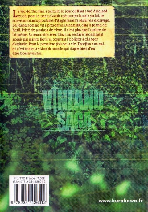 La vie de Thorfinn a basculé le jour où Knut a tué Askeladd et où, pour le punir d'avoir osé porter lamain sur lui, le nouveau roi autoproclamé d'Angleterre l'a vendu en esclavage. Le jeune homme vit à présent au Danemark, dans la ferme de Ketil. Ou du moins survit. Privé de sa raison de vivre, il n'est plus que l'ombre de lui-même. Sa rencontre avec Einar, un esclave récemment acquis par maître Ketil va pourtant l'obliger à changer d'attitude. Einar est aussi plein de vie que Thorfinn est apathique, et il est bien décidé à reconquérir sa liberté en travaillant dur. Pour la première fois de sa vie, Thorfinn a un ami, et c'est toute sa vision du monde qui risque bien d'en être bouleversée.