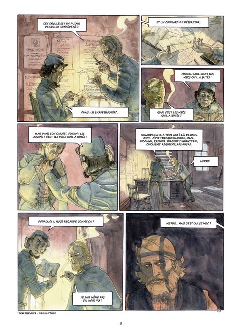 Louisiane, hiver 1863, en pleine Guerre de Sécession américaine. Dans la petite ville de Lake Providence tenue par les troupes de l'Union, Doyle, un déserteur sudiste à bout de force, tue plusieurs soldats qui s'apprêtaient à pendre une enfant noire. Alcoolique et morphinomane, assailli par des crises d'hallucinations de plus en plus violentes, Doyle fuit un souvenir obsédant : contraint lors d'une mission d'assassiner de sang froid une petite fille en même temps que son père, haut gradé yankee, cet ancien tireur d'élite de l'armée confédérée est hanté depuis lors par le fantôme sanglant de sa jeune victime. Emprisonné pour le meurtre des soldats qu'il vient d'abattre, et promis à la potence, Doyle est contre toute attente libéré par un commando de Noirs, emmenés par la fillette qu'il a sauvée de la corde. Cette petite communauté de maroons - d'anciens esclaves en fuite qui se sont réfugiés dans les marais, au plus profond des bayous - a besoin de son expérience de soldat pour l'aider à rejoindre le Canada, promesse de liberté. Encore faut-il que Doyle, toujours en butte aux visions sanglantes que semble partager avec lui la petite Noire qui lui doit la vie, puisse retrouver sa lucidité. Après Morphée, voici la deuxième époque de cette très prenante histoire de fuite et de quête, que le tandem Blary / Gauthier, nouveaux venus chez Casterman, interprètent avec beaucoup de personnalité.