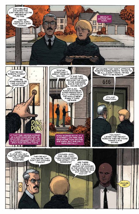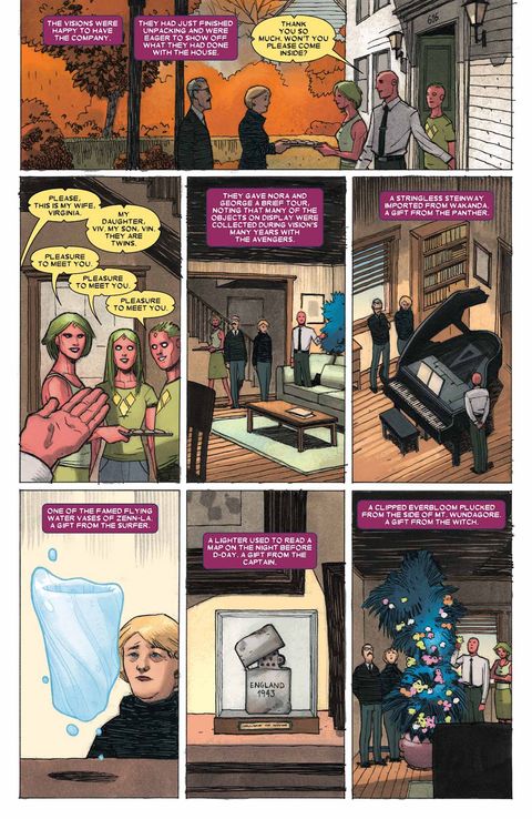 Vision, l'androïde né pour détruire les Avengers mais qui s'est rebellé contre sa programmation, souhaite aujourd'hui mener une vie ordinaire. Il est marié, a des enfants, un chien et une vie tranquille en banlieue. Tout se passait pour le mieux jusqu'à ce que la mort vienne toquer à la porte de la famille Vision. Cette maxi-série est très certainement l'une des meilleures sagas Marvel de ces dix dernières années. Elle explore le concept d'humanité et des relations familiales au travers de robots capables d'analyser froidement toutes leurs émotions. Cela donne un bijou unanimement salué par les fans et la critique, au point que cette série a été couronnée d'un Eisner Award.