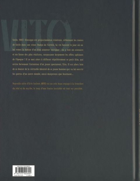 Aux frontières d’un monde mythique Giuseppe est projectionniste itinérant, sillonnant les routes de Sicile dans sa Dodge de l’armée. On lui remet un jour la bobine d’un film amateur intrigant : on y voit un centaure et un faune des plus réalistes, surpassant largement les effets spéciaux dernier cri ! Il se met alors à diffuser régulièrement ce petit film, qui attire fortement l’attention d’un jeune spectateur, Vito. Giuseppe se prend d’affection pour lui, et tente à la fois d’en apprendre plus sur son histoire et de le protéger de ses mystérieux poursuivants... Cette amitié sera un pas décisif vers un univers fantastique dont Giuseppe ne soupçonnait pas l’existence ! Vito est la nouvelle série d’Éric Stalner, qui plus est en couleurs directes, qui revient au fantastique, genre qu’il n’avait pas abordé depuis le magnifique Roman de Malemort ! Un très beau voyage à la frontière entre le réel et le mythe, la limite invisible où tout est possible.