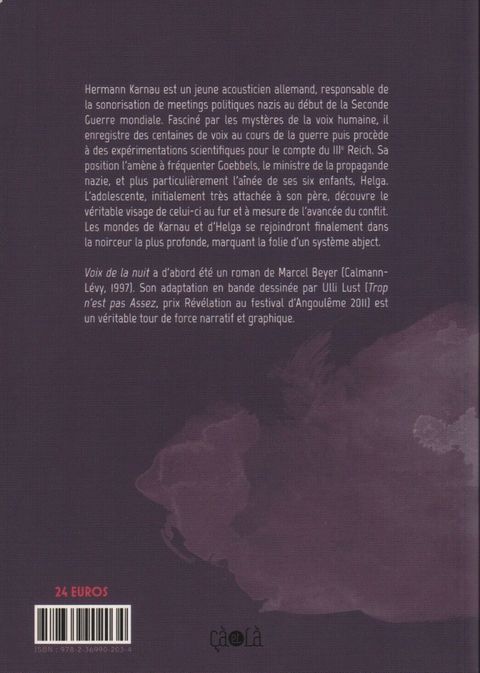 Hermann Karnau est acousticien, une sorte d'archéologue des sons. La voix humaine est son obsession. En 1940, il décide d'explorer systématiquement ce phénomène et, repéré par les nazis, met son savoir-faire au service du IIIe Reich. Dans sa frénésie de prouver que la langue allemande est « quelque chose que l'on a dans le sang depuis la naissance », Karnau enregistre des centaines de voix, passant du râle des mourants sur le front russe au gargouillis de gorges ouvertes au bistouri, et procède à des expérimentations scientifiques afin d'obtenir la voix aryenne la plus pure. Sa position l'amène à fréquenter Goebbels, le ministre de la propagande nazie et plus particulièrement l'aînée de ses six enfants, Helga. En avril 1945, l'Armée Rouge est dans Berlin. Un dernier carré de notables s'enferme dans le bunker d'Hitler avec Karnau et la famille d'Helga. Les voix de l'acousticien et de l'adolescente se font écho jusqu'à la fin, quand Karnau enregistre les derniers instants des enfants assassinés.