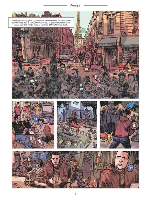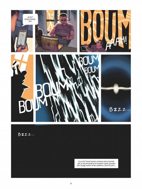 Plus loin que la nuit et le jour. Franck vit avec son temps. C'est un homme qui, comme une foule de gens pressés, s'est laissé emporter par la vague digitale sans s'interroger... Jusqu'au jour où son téléphone et son ordinateur cassent accidentellement. Franck se voit alors contraint d'attendre chez lui pendant dix longues journées l'appel du S.A.V... Pendant toute cette période, il ne peut plus accéder à cet espace numérique où les pensées s'occupent sans être stimulées. La rupture est brutale, et le manque d'abord sévère. Coincé entre les quatre murs de son appartement, il cherche désespérément à s'occuper et finit par s'atteler à une minutieuse visite de cet endroit dans lequel il vit quotidiennement, mais qu'il ne regardait plus. Franck va vite réaliser qu'il lui suffit d'un mouvement de la pensée pour s'évader et que les seules limites sont celles de son imagination. Au cours de ses voyages immobiles, Franck visite un bouge de la renaissance, s'invite à une soirée de la Fashion Week ou revit de manière nuancée les derniers instants d'une relation amoureuse passée... Alors que le monde a plus que jamais saisi le sens du mot confinement, Voyage autour de ma chambre raconte aussi le bonheur des frontières sans limite. Libre adaptation du roman de Xavier de Maistre écrit en 1794, on y retrouve un récit où le voyage et l'épopée émergent du rien. Mais, en déplaçant l'histoire et en l'habillant de jolis traits, Aurélie Herrou et Sagar l'ont entièrement renouvelée. Une odyssée qui résonnera avec le quotidien de nombre d'entre nous.