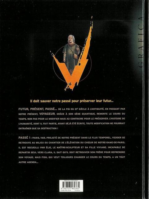Quand passé, présent et futur ne forment plus qu'un seul espace temps d'aventure. On ne dose pas toujours très bien les effets d'un saut temporel... Mark le Voyageur, alors qu'il tentait d'échapper à son présent pour sauver Clara et son enfant, en fait l'amère expérience en s'écrasant sur les échafaudages de Notre Dame de Paris... en 1165 ! Jeté dans une geôle crasseuse, il comprend très vite que ses fabuleux pouvoirs, érodés par la fatigue, ne lui permettront pas de s'échapper du Moyen Âge... Heureusement, Elie, fameux maître sculpteur, semble prêt à le prendre sous son aile. Une nouvelle vie commence pour Mark. Si ce n'est que la cicatrice qu'il porte sur le front, ici comme ailleurs, va vite le précipiter dans les pires ennuis... Troisième mouvement de l'étourdissante saga intertemporelle, orchestrée par Boisserie et Stalner, Voyageur Passé, servi pour cet album par le talentueux Rollin, éclaire d'une lumière toujours plus fascinante l'une des intrigues les plus originales et cohérentes qui soient.