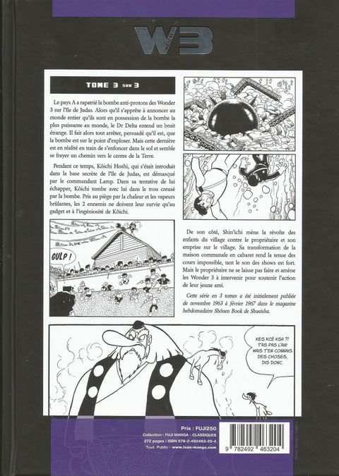 Année 196X, la Terre est le théâtre d'essais nucléaires, de guerres, de conflits à répétition. La situation est telle que la Fédération de la Voie Lactée, regroupant les êtres vivants supérieurs de la galaxie, est en plein débat pour savoir si la Terre doit être sauvée ou détruite. Ils décident d'envoyer les Wonder 3, un escadron de la patrouille cosmique, pour évaluer l'Humanité. Prenant l'apparence d'un lapin, un canard et un cheval, les enquêteurs extra-terrestres se lient d'amitié avec le jeune Shin'ichi et son grand frère, Kôichi. Ce dernier est membre d'une agence secrète qui oeuvre pour la paix et combat des conspirationnistes prêts à tout par avidité. Les Wonder 3 sont choqués par le comportement des Hommes et confortés dans leur idée de détruire la planète. Heureusement, la bonté de Shin'ichi les fait peu à peu changer d'avis. Cela sera-t-il suffisant ? Retrouver en bonus des frontispices et des illustrations couleurs. Fin de la série, Tome 3 sur 3.