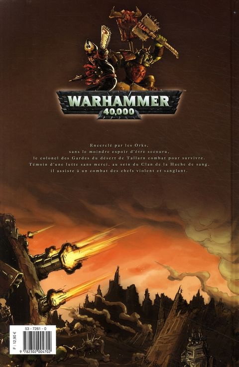 Encerclé par les orks, sans le moindre espoir d'être secouru, le colonel des gardes du désert de tallarn combat pour survivre. Témoin d'une lutte sans merci, au sein du clan de l hache de sang, il assiste à un combat des chefs violent et sanglant.