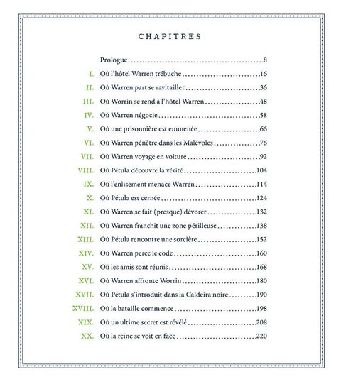 Bienvenue à l'hôtel Warren, le premier hôtel ambulant au monde ! Le jeune Warren est le treizième directeur de cet incroyable manoir capable de se déplacer. Grâce à lui, le garçon emmène ses amis et ses clients dans de formidables voyages aux quatre coins du pays. Jusqu'au jour où son hôtel trébuche au beau milieu des Malévoles, une mystérieuse forêt réputée pour ses sorcières, ses arbres parlants et ses monstres en tout genre... L'hôtel du jeune Warren, désormais très célèbre, attise bien des convoitises, et plus particulièrement celle de la terrible reine Calvina. Cette dernière promet une récompense phénoménale à quiconque lui livrera le manoir ambulant. Alors que l'hôtel est bloqué au beau milieu des Malévoles, une forêt tout aussi effrayante que mystérieuse, Warren se retrouve séparé de ses amis. Le pire se produit alors : des sorcières attaquent l'hôtel et un Imitateur, prenant l'apparence de Warren, usurpe sa place de directeur. Pour empêcher le voleur de forme de livrer son hôtel à la reine Calvina, Warren se lance dans un contre-la-montre semé d'embûches dans les Malévoles. Pendant son périple, Warren doit faire face à des arbres parlants, des serpents, des poseurs d'énigmes et surtout des pressesèvres, ces terribles créatures qui hantent les Malévoles... Le jeune Warren réussira-t-il à sauver ses amis et son hôtel ? Rien n'est moins sûr.