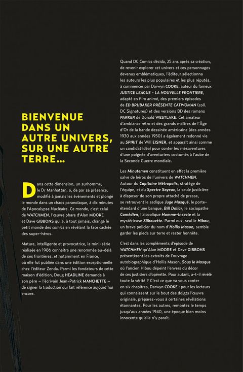 Au début des années 1940, une mode des aventuriers costumés a frappé les États-Unis incitant plusieurs individus à se déguiser afin de rendre la justice. Parmi eux, le Comédien, le Hibou, le Spectre Soyeux, Capitaine Métropolis, le Juge Masqué, l’Homme Insecte, la Silhouette et Bill Dollar se sont regroupés en une organisation, les Minutemen, pour le meilleur et surtout pour le pire.