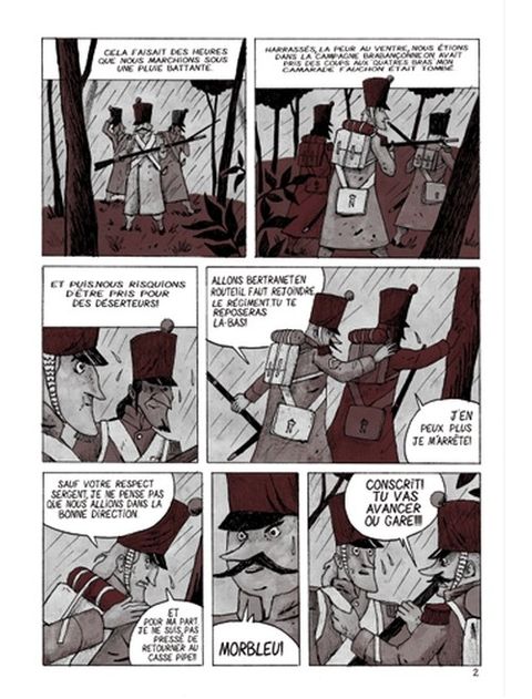 Campagne de Belgique, 17 juin 1815 quelque part entre Charleroi et Bruxelles. La veille, Napoléon et ses généraux ont mis en déroute l’armée prussienne avant de marcher sur Bruxelles et d’affronter les troupes anglaises. Trois fantassins français sont perdus. Ils tentent de regagner leur régiment sans doute plus au nord. La pluie, la faim, la fatigue et la peur de rencontrer l’ennemi les accompagnent. Lors d’une rixe, ils blessent un cavalier prussien. Les trois hommes décident de ramener l’officier avec eux.