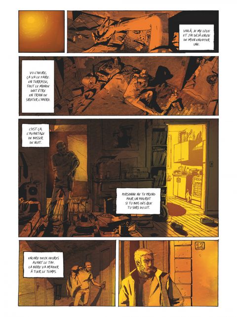 Une nuit, 19 destins, une foule de mauvais choixDe 20h à 8h du matin, les destins de 19 protagonistes s’entrecroisent dans la nuit lyonnaise. Ils sont flics, chauffeur de taxi, veilleur de nuit, … certains sont à un tournant de leur vie, d’autres s’enlisent dans la routine. La plupart ne se connaissent même pas. Pendant que l’un passe une soirée torride, d’autres préparent un braquage, se lamentent sur leur job, ou attendent simplement le bon moment pour sauter dans le vide. Pourtant ces parcours vont finir par  s’entremêler et les actions de certains auront des répercussions qu’ils ne pouvaient imaginer. Dans ce récit parfaitement huilé où l’étau se resserre autour des protagonistes au fur et à mesure que l’on apprend à les connaître, l’atmosphère devient suffocante et l’adrénaline monte d’un cran. On doute jusqu’au dernier instant du sort que réserve l’auteur à ses personnages, qui s’accrochent et se débattent dans la nuit. Ozanam pose une à une les pièces d’un puzzle narratif d’envergure sans jamais perdre son lecteur. En toile de fond, on devine la fragilité des relations humaines et toutes les influences cinématographiques. L’art du récit, totalement maîtrisé, vient s’appuyer sur les dessins réalistes aux traits nerveux de Kieran, pour proposer un polar d’ambiance teinté d’humour.