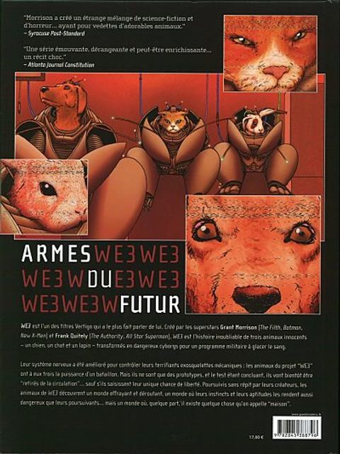 WE3 est l'un des titres Vertigo qui a le plus fait parler de lui. Créé par les superstars Grant Morrison (The Filth, Batman, New X-Men) et Frank Quitely (The Authority, All Star Superman), WE3 est l'histoire inoubliable de trois animaux innocents - un chien, un chat et un lapin - transformés en dangereux cyborgs pour un programme militaire à glacer le sang. Leur système nerveux a été amélioré pour contrôler leurs terrifiants exosquelettes mécaniques : les animaux du projet ""WE3"" ont à eux trois la puissance d'un bataillon. Mais ils ne sont que des prototypes, et le test étant concluant, ils vont bientôt être ""retirés de la circulation""... sauf s'ils saisissent leur unique chance de liberté. Poursuivis sans répit par leurs créateurs, les animaux de WE3 découvrent un monde effrayant et déroutant, un monde où leurs instincts et leurs aptitudes les rendent aussi dangereux que leurs poursuivants... mais un monde où, quelque part, il existe quelque chose qu'on appelle ""maison"".