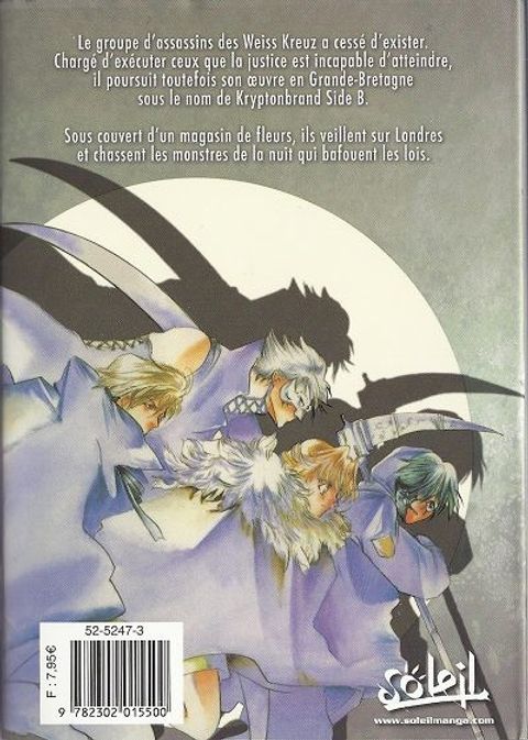 Le groupe d'assassins des Weiss Kreuz a cessé d'exister. Chargé d'exécuter ceux que la justice est incapable d'atteindre, il poursuit toutefois son oeuvre en Grande-Bretagne sous le nom de Kryptonbrand Side B (K.R.) avec notammant Aya et Ken parmi les six assassins. Sous le couvert d'un magasin de fleur, ils veillent sur Londres et chassent les monstres de la nuit qui bafouent les lois. Une licence mythique du shonen-ai apparaît enfin en France !
