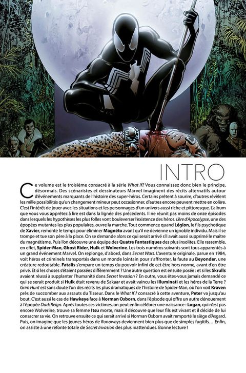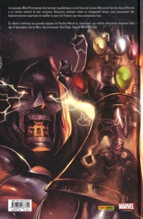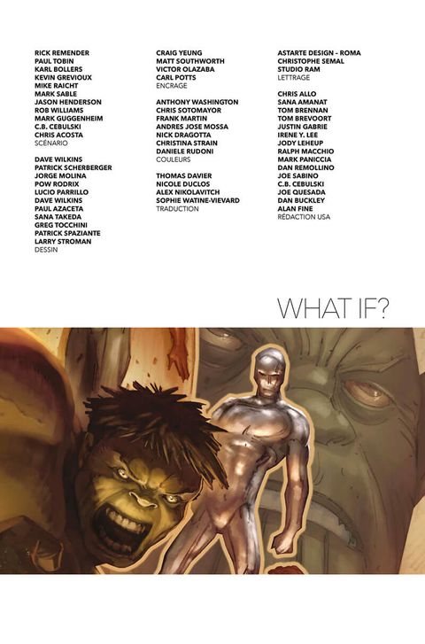 Et si la Sorcière Rouge avait annulé les pouvoirs de tous les surhumains à la fin de House of M ? Si après Civil War, ce n'est pas May mais Mary Jane qui avait reçu une balle ? Si Wolverine avait sauvé son enfant en tuant le Soldat de l'Hiver ? Cet album dissipe nos doutes en nous proposant une autre version de grands évènements qui ont bouleversé l'univers Marvel. World War Hulk, L'Ère d'Apocalypse ou encore Secret Invasion sont également au programme. Notons qu'une série d'animation What If ? sera diffusée en 2020 sur Disney+.