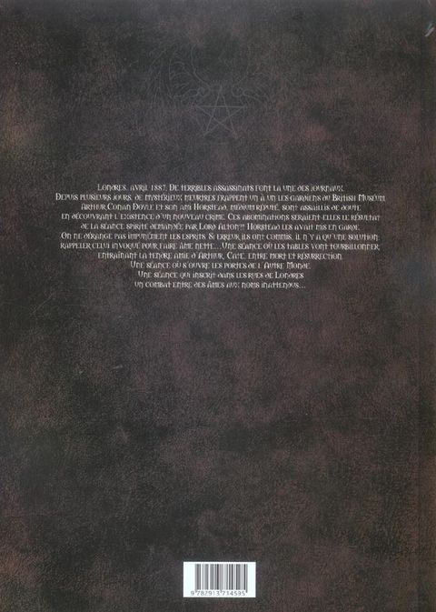 Londres, avril 1887. De terribles assassinats font la une des journaux. Depuis plusieurs jours, de mystérieux meurtres frappent un à un les gardiens du British Muséum. Arthur Conan Doyle et son ami Horstead, médium réputé, sont assaillis de doute en découvrant l'existence d'un nouveau crime. Ces abominations seraient-elles le résultat de la séance spirite demandée par Lord Alton ?! Horstead les avait mis en garde. On ne dérange pas impunément les esprits. Si erreur ils ont commis, il n'y a qu'une solution : rappeler celui invoqué pour faire âme nette... Une séance où les tables vont tourbillonner, entraînant la tendre amie d'Arthur, Cate, entre mort et résurrection.