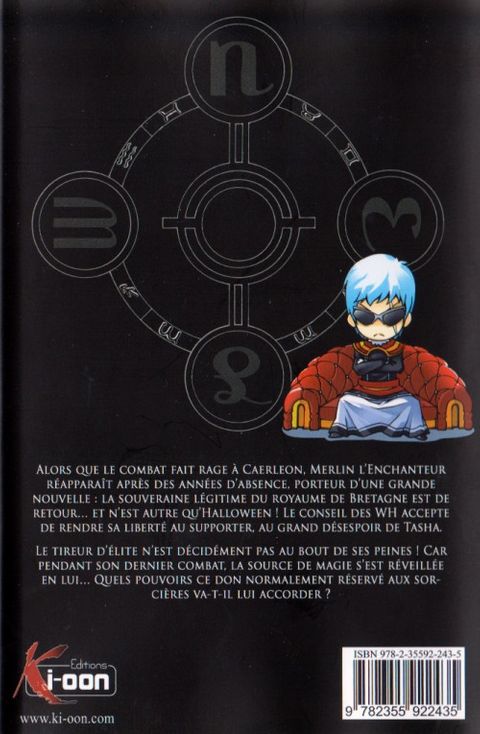 Alors que le combat fait rage à Caerleon, merlin l'enchanteur réapparaît après des années d'absence. Porteur d'une grande nouvelle : la souveraine légitime du royaume de Bretagne est de retour... Et n'est autre qu'Halloween ! Le conseil des WH accepte de rendre sa liberté au supporter. Au grand désespoir de Tasha. Le tireur d'élite n'est décidément pas au bout de ses peines ! Car pendant son dernier combat ; la source de magie s'est réveillée en lui... Quels pouvoirs ce don normalement réservé aux sorcières va-t-il lui accorder ?