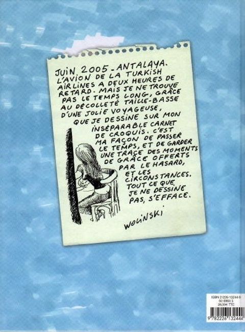 Juin 2005 - antalaya. L'avion de la turkish airlines a deux heures de retard. mais je ne trouve pas le temps long, grâce au décolleté taille-basse d'une jolie voyageuse, que je dessine sur mon inséparable carnet de croquis. c'est ma façon de passer le temps, et de garder une trace des moments de grâce offerts par le hasard et les circonstances. tout ce que je ne dessine pas s'efface. wolinski.