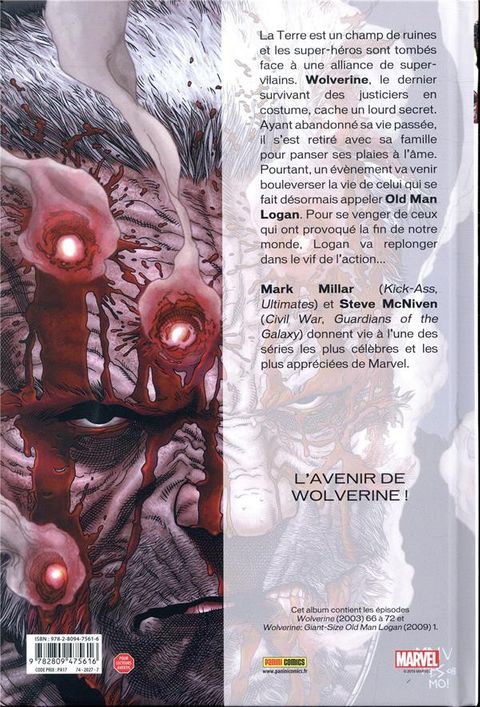 Dans un monde futuriste, dévasté par les pires criminels, les États-Unis ont perdu leur splendeur. Suite à la victoire des super-vilains, les frontières ont été redéfinies et la population dépérit, abandonnée par ses nouveaux dirigeants. Quand le concept même de héros n’est plus qu’un vieux souvenir, comme l’espoir et la dignité, que peut-il advenir de l’humanité ? Dans le désert de Californie, une terre désolée, contrôlée par le gang de Hulk, Logan rêve de vivre en paix auprès de sa femme et de ses enfants. Loin de son passé au sein des X-Men, l’ancien héros n’aspire désormais qu’à une paisible vie de famille... La saga culte de Mark Millar et Steve McNiven dans une édition enrichie d'articles. Contient : Wolverine (2003) 66 à 72 et Giant Size 2.