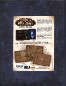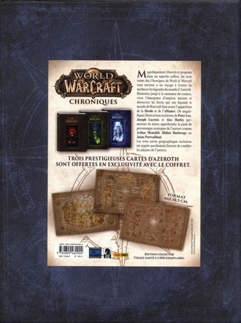 Magnifiquement illustrés et proposés dans un superbe coffret, ces romans offrent des dessins exclusifs, ainsi que des cartes montrant les évolutions d'Azeroth à travers le temps. Les trois lithographies exclusives finiront de combler les adeptes de l'univers. Ce coffret contenant les trois tomes des Chroniques de World of Warcraft vous invite à un voyage à travers les mythes et les légendes du monde d'Azeroth. Remontez jusqu'à la naissance du cosmos, vivez l'émergence d'empires anciens et découvrez les forces qui ont façonné le monde de Warcraft bien avant l'apparition de la Horde et de l'Alliance. De magnifiques illustrations exclusives de Peter Lee, Joseph Lacroix et Alex Horley permettent aussi de mieux appréhender le passé de personnages iconiques de l'univers comme Arthas Menethil, Ilidan Hurlorage ou Jaina Portvaillant.