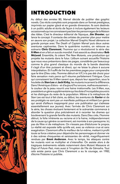 Un nouvel et terrible adversaire apparaît pour les Enfants de l'Atome. William Stryker s'est autoproclamé dieu pour justifier ses actes et ceux de ses sbires. Ces assassins barbares sont prêts à tout pour éradiquer les mutants de la Terre, qu'ils jugent indignes de vivre. Les X-Men et Magnéto vont devoir mettre leurs différends de côté et unir leurs forces pour affronter cet effroyable ennemi. L'aventure qui a inspiré X-Men 2, le film de l'année réalisé par Bryan Singer, avec Halle Berry, Hugh Jackman, Ian McHellen et Patrick Stewart. Cette histoire est un parfait exemple de la métaphore mutante, symbole de l'oppression des minorités. Un récit parmi les plus incontournables de Chris Claremont, des X-Men et plus généralement de Marvel. Le révérend William Stryker lance une croisade anti-mutants et capture le Professeur X pour le manipuler afin d'attaquer l'esprit des mutants. Pour le combattre, les X-Men doivent alors s'allier à leur ennemi Magnéto. Contient le graphic novel X-Men: God Loves, Man Kills (1982).