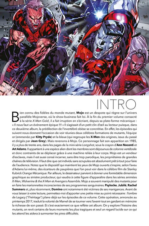 Mojo, le maître des shows de téléréalité meurtriers, prend la Terre pour cible. Les mutants se réunissent pour le neutraliser. Les deux formations X se retrouvent alors face aux Sentinelles et aux Broods. Bien qu'assaillis par de funestes souvenirs, Kitty Pryde, Jean Grey et leurs coéquipiers poursuivent leur combat jusque sur Mojoworld où ils luttent pour empêcher que Manhattan ne se métamorphose en un monde tout aussi sordide et violent. Les X-Men, déstabilisés par le retour inattendu de Kologoth, vivent ensuite une épopée cosmique dans la Zone Négative. Deuxième des trois tomes de la série X-Men Gold, l'une des plus récentes consacrée aux mutants. Il contient notamment l'intégralité du crossover avec la série X-Men Blue.