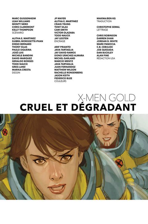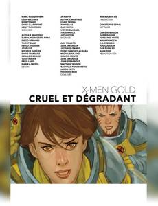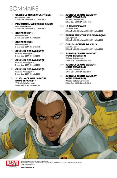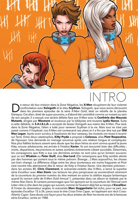 Suite à un combat qui tourne mal, Rachel Summers, Kitty Pryde et Tornade sont emprisonnées. Quelle nouvelle formation prendra la relève et deviendra l'équipe Or des X-Men ? Ce n'est que le hors-d'oeuvre d'un album dont la pièce de résistance est le mariage tant attendu de deux personnages parmi les plus appréciés de l'univers des X-Men : Kitty Pryde et Colossus. A moins que, dans la grande tradition mutante, rien ne se passe comme prévu... En plus, un épisode spécial fêtant les trente ans de l'équipe Excalibur ! La série X-Men Gold de Marc Guggenheim tente de réinventer l'esprit des X-Men de Chris Claremont, avec l'idée d'une famille atypique, celle des mutants, au sein de laquelle les drames sentimentaux ont autant d'importance que la lutte contre les Sentinelles ! Kitty Pryde et Colossus, dont l'histoire d'amour contrariée remonte aux années 80, sont au centre de ce nouvel album.