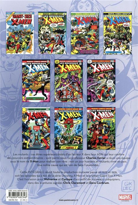 Les X-Men ont 50 ans cette année ! Pour fêter l’événement, Panini Comics réédite les premières INTEGRALES devenues aujourd’hui introuvables. Le Professeur Charles Xavier poursuit un rêve. Voir enfin les hommes et les mutants vivre ensemble dans la paix et l’harmonie. Pour mener à bien son oeuvre, il réunit une équipe de héros tous dotés d’un gène X qui fait d’eux des êtres supérieurs, les X-Men. Mais aussi noble que soit leur cause, le jour de la victoire est encore loin. Cet ouvrage réunit toute la production parue aux États-Unis en 1975-1976, à savoir les épisodes 94 à 102 de la série Uncanny X-Men, plus le premier Giant Size X-Men. C’est l’occasion pour Wolverine et Cyclope d’accueillir de nouveaux coéquipiers dans des aventures immortalisées par Chris Claremont et Dave Cockrum.