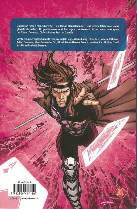 Cette année, nous vous proposons de réviser vos classiques : connaissez-vous bien les origines de tous les X-Men ? Des stars montantes du monde des comics, parmi lesquelles Christopher Yost (X-Force) et Trevor Hairsine (X-Men: Deadly Genesis), revisiteront les premiers pas des plus importants membres des équipes mutantes à travers une série de one-shots qui vous seront proposés dans trois albums 100% MAR VEL. Dans ce premier tome, nous nous intéressons à Colossus, Diablo, Emma Frost et Deadpool. Un menu alléchant !