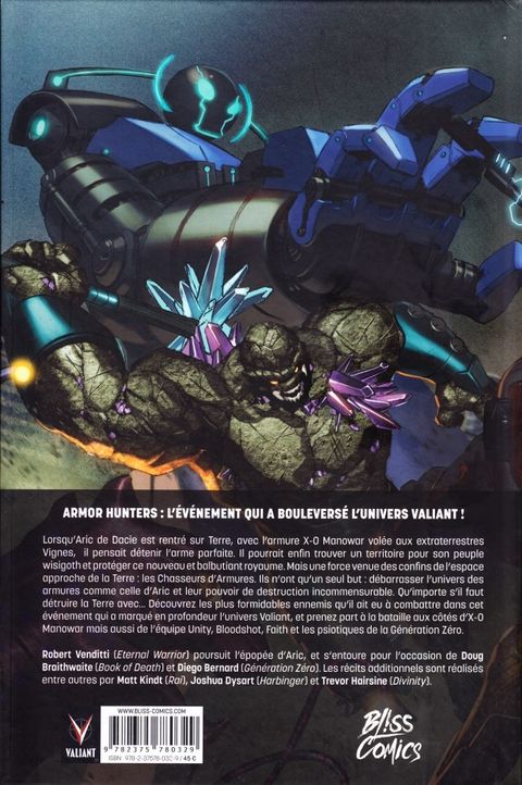 Lorsqu’Aric de Dacie est rentré sur Terre, avec l’armure X-O Manowar volée aux extraterrestres Vignes, il pensait avoir trouvé l’arme parfaite. Il pourrait enfin trouver un territoire pour son peuple wisigoth et protéger ce nouveau et balbutiant royaume. Mais une force venue des confins de l’espace approche de la Terre : les Chasseurs d’Armures. Ils n’existent que dans un but : débarrasser l’univers des armures comme celles d’Aric et leur pouvoir de destruction incommensurable. Qu’importe s’il faut détruire la Terre avec... L’origine de la mystérieuse armure sera enfin révélée dans ce deuxième cycle des aventures d’Aric de Dacie. Découvrez les plus formidables ennemis qu’il aie eu à combattre dans cet événement qui a marqué en profondeur l’univers Valiant, et prenez part à la bataille aux côtés d’X-O Manowar mais aussi de l’équipe Unity, Bloodshot, Faith et les psiotiques de la Génération Zéro.