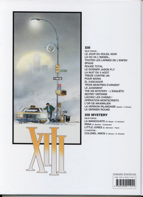 Un amnésique est recueilli et soigné par un couple de retraités, Abe et Martha. Il a un XIII tatoué sur la clavicule. Le couple est assassiné par deux hommes que XIII tue. Sur l'un d'eux, il trouve une photo le montrant avec une jeune femme... Un solide gaillard aux allures de baroudeur se retrouve sans nom, sans passé, sans souvenir, dans un lieu inconnu. Son seul début d'indice pour découvrir son identité est un chiffre, XIII, qu'il porte en tatouage. Sa position est d'autant plus inconfortable qu'une bande de tueurs est à ses trousses. De plus, il découvre que de hautes personnalités civiles et militaires s'intéressent à lui.