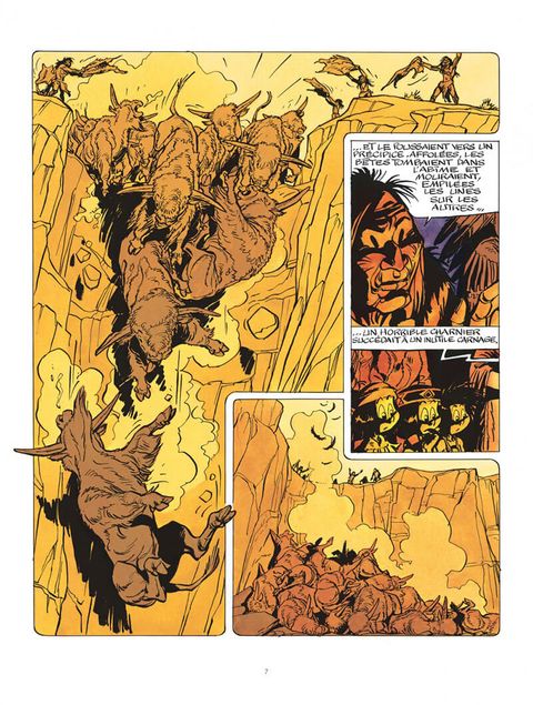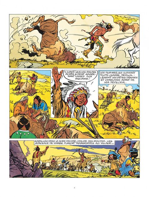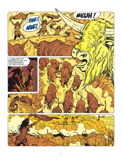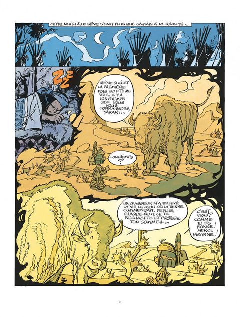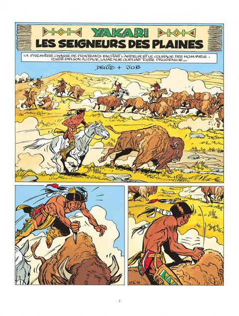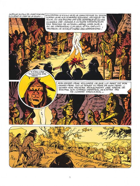 Autour du feu de camp, chacun écoute le chef de la tribu évoquer les temps anciens et cruels où les premiers Hommes Rouges chassaient les hardes de bisons aux cornes géantes. Yakari est fasciné. Il veut revoir les bisons, afin de mieux les connaître. Il retrouve le grand troupeau et assiste, par hasard, au vêlage d'une bisonne. Mais Yakari n'est pas seul : un loup bête et méchant guette déjà le nouveau-né, bien décidé à s'en repaître !