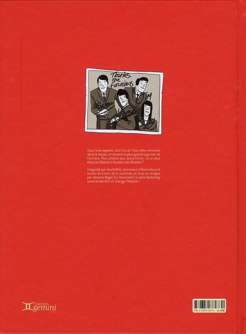 8 décembre 1980 : John Lennon est assassiné. Le même jour naît John Duval, dans une clinique bourgeoise de Paris. Vingt-trois ans plus tard, John débarque à New York, 5000 dollars en poche mais le lendemain matin, de façon inexplicable, il se réveille en ... 1960. Le petit frenchie décide d'en prendre son parti : il tombe rapidement amoureux d'une femme qui le délaisse pour un certain Bob Dylan, un jeune chanteur de folk. C'est alors qu'il décide de monter un groupe, les Futurians, qui deviendra célèbre grâce au titre Yesterday : ça ne vous rappelle rien ? Hommage aux Beatles et à l'histoire du rock truffé de références, Yesterday est surtout l'aventure décomplexée d'un homme qui, victime d'une faille temporelle, va devenir célèbre en reprenant tous les tubes du plus grand groupe du monde.