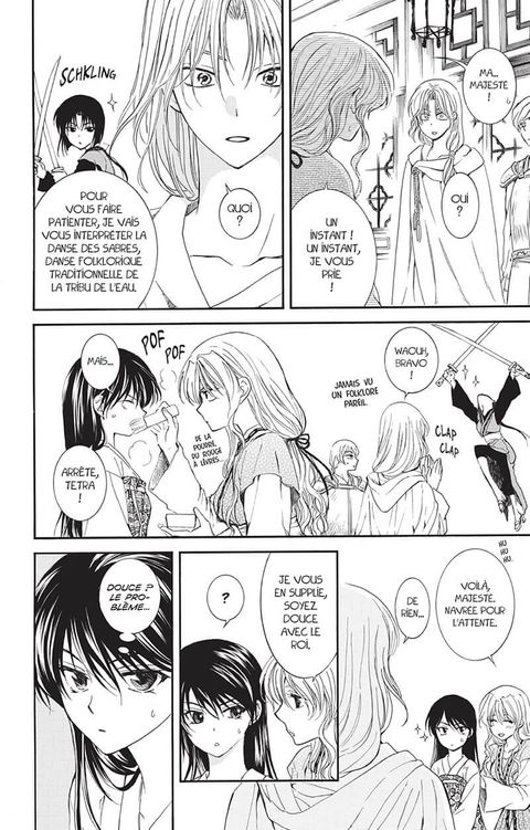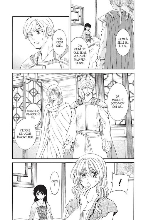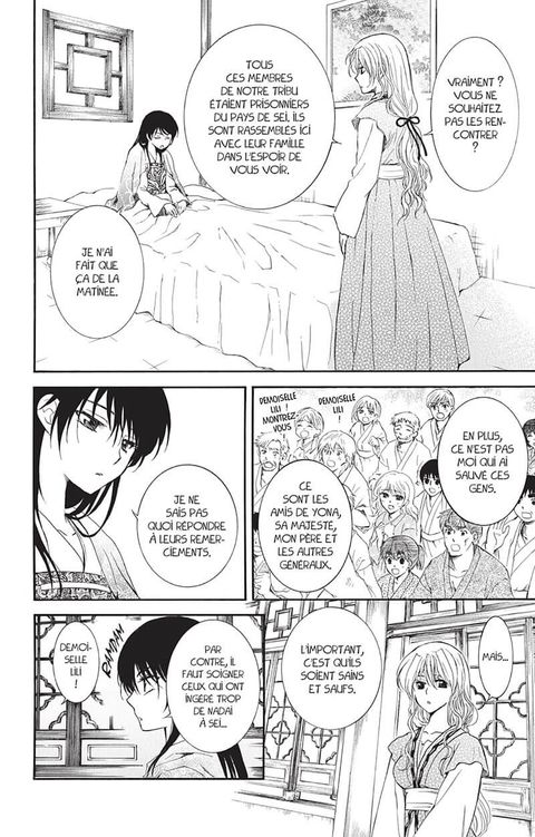 Après les terribles aventures aux forts du pays de Sei, Yona prend peu à peu conscience de ses sentiments pour Hak et se confie à son amie Lili. En ville, la rumeur grossit de quatre guerriers dragons et d'une jeune fille aux cheveux rouges qui apparaîtraient sur les champs de bataille... Alors qu'ils quittent le pays de Sei par les montagnes à la frontière avec le pays de Shin, Yona et sa bande tombent sur un groupe d'hommes masqués...