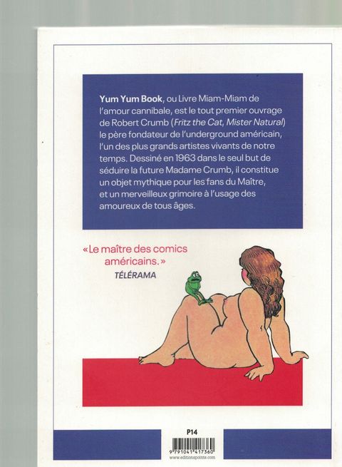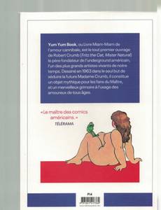 yum yum book ou livre miam-miam de l'amour cannibale, est le tout premier ouvrage de robert crumb (fritz the cat, mister natural) le père fondateur de l'undergound américain, l'un des plus grands artistes vivants de notre temps. dessiné en 1963 dans le seul but de séduire la future madame crumb, il constitue un objet mythique pour les fans du maître et un merveilleux grimoire â l'usage des amoureux de tous âges.