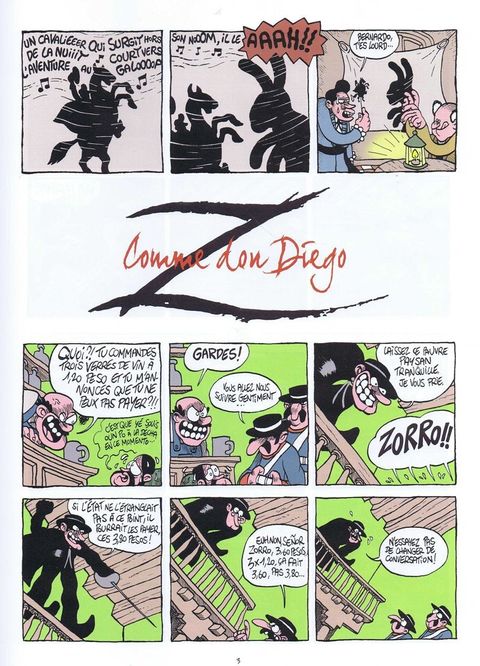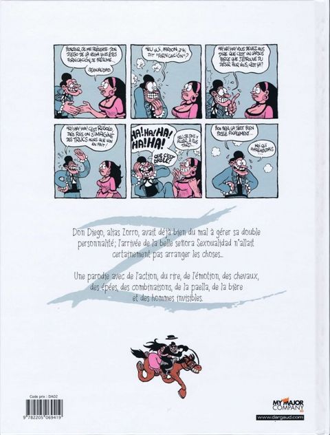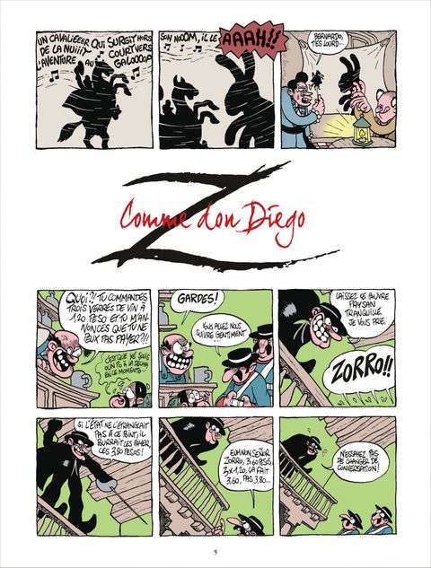 Z comme don Diego, dont Fabcaro et Fabrice Erre présentent le 1re tome, est une parodie à mourir de rire de Zorro. Don Diego de la Vega, alias Zorro, c'est un peu comme Clark Kent, alias Superman : pour mieux jouer les super-justiciers masqués, ils s'abritent, dans la vie de tous les jours, derrière une personnalité aussi neutre et insignifiante que possible. Et comme on le découvre dans ce 1er épisode de Z comme don Diego, ce n'est pas toujours simple ! Don Diego a bien du mal à garder secrète sa véritable identité, surtout lorsque son père, don Alexandro, ivre mort, hurle à qui veut l'entendre que son fils est le célèbre Zorro ! Don Diego lui-même serait bien tenté de révéler sa double personnalité lorsqu'il courtise la séduisante Señorita Sexoualidad... Tous les protagonistes de Zorro, de Bernardo au sergent Garcia en passant par Tornado, se succèdent, pas forcément sous leur meilleur jour, dans Z comme don Diego, une adaptation loufoque et délirante de la mythique série.