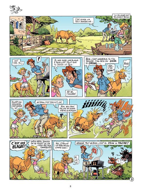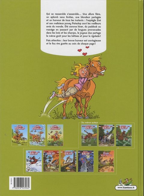 L'amitié au Triple Galop ! Qui se ressemble s'assemble. Une allure fière, un aplomb sans limites, une blondeur partagée et un humour de tous les instants : l'espiègle Zoé et son malicieux poney Pataclop sont les meilleurs amis du monde. Été comme hiver, du paddock au manège en passant par de longues promenades dans les bois et les champs, le joyeux duo partage le même goût pour les bêtises et pour la rigolade ! Fais attention : leur bonne humeur est contagieuse et le fou rire guette au coin de chaque page !