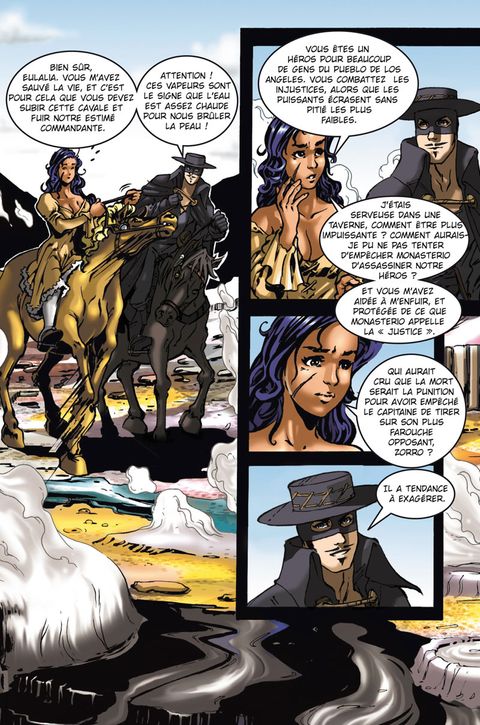 Il y a des choses immuables : Zorro est toujours Don Diego de la Vega sous le masque, et il défend toujours la veuve et l'orphelin grâce à son fouet et son épée. Mais il est cette fois aux prises avec l'amour ! Il cherche un havre de paix pour la belle et farouche Eulalia Bandini. Au fur et à mesure de leur vie commune durant cette quête, elle a deviné son identité secrète ! Dans cette Amérique encore sauvage, ils vont devoir surmonter à deux les plus grands dangers, et combattre de nombreux ennemis !Voici trois épisodes de Zorro entre comics et manga, plus inspirés du film Le Masque de Zorro de 1998 que de la série en noir et blanc, et dans un format à glisser dans sa poche ! De quoi remettre le héros masqué des années 50 au goût des jeunes lecteurs d'aujourd'hui !